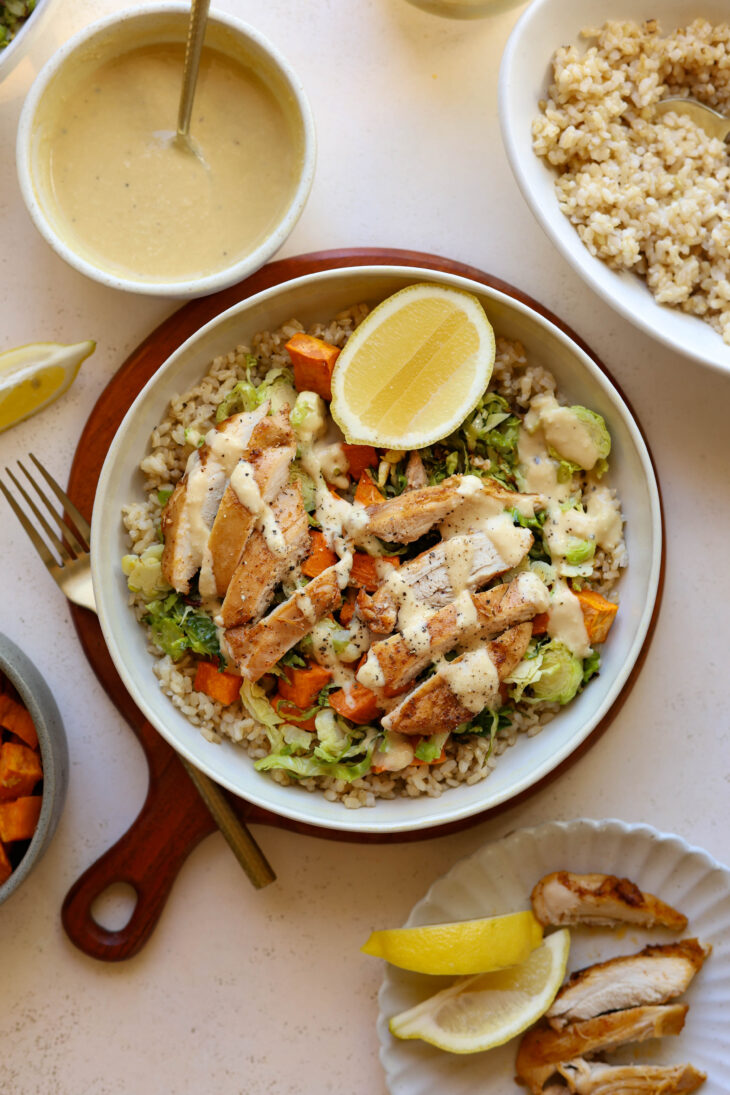 Assemble your bowl: Add a base of brown rice, top with roasted brussels & sweet potato, sliced chicken, and drizzle with the lemony Caesar. Finish with fresh Parmesan and an extra squeeze of lemon. Enjoy!