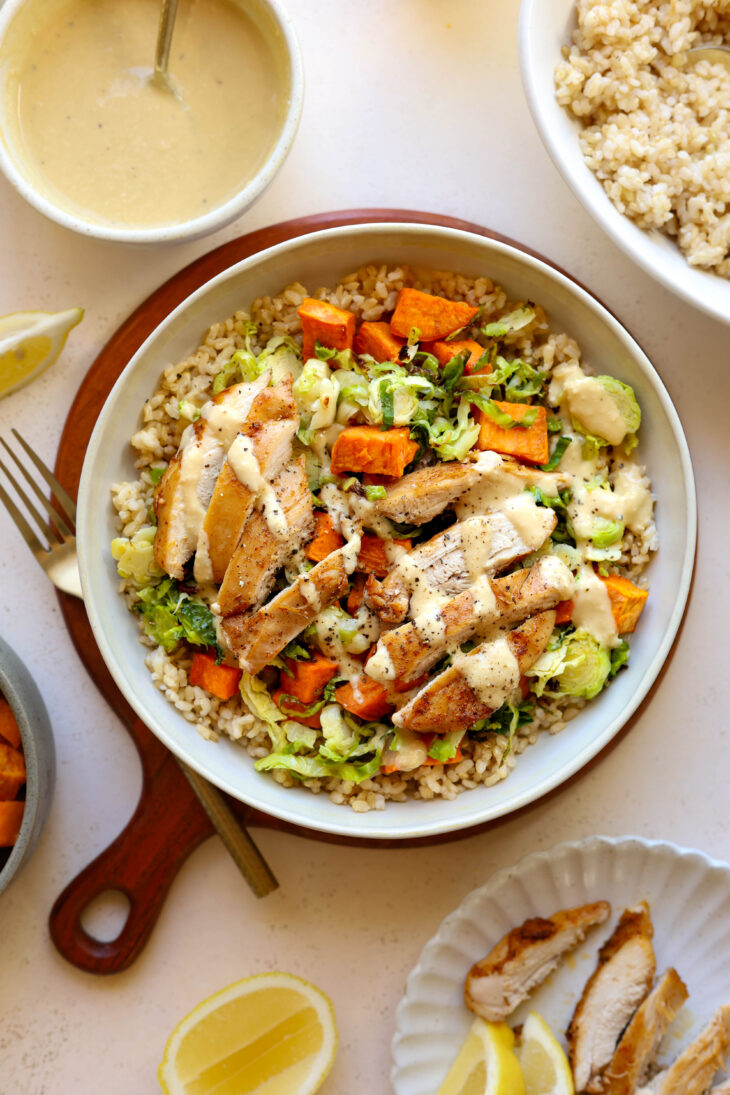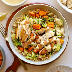 • Assemble your bowl! Add a base of brown rice, top with the roasted brussel sprouts, sweet potato, chicken, and finish with a drizzle of the dressing. Serve with fresh parmesan and an extra squeeze of lemon. Enjoy!