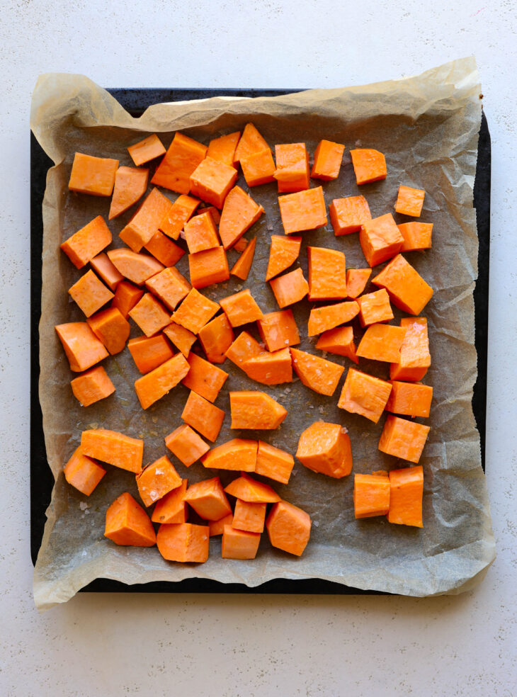 • Preheat the oven to 425°F. Toss sweet potatoes with 1 tablespoon of olive oil and season with salt. Spread them on a lined baking sheet and roast for 10 minutes.