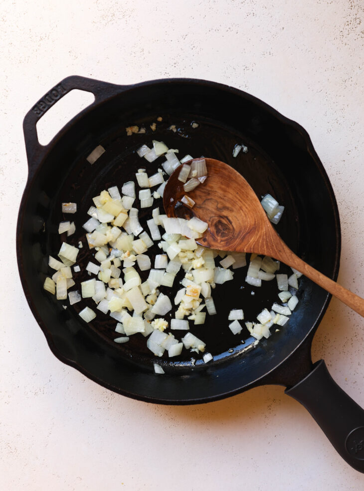 Make the filling: preheat your oven to 425°F. In a skillet with avocado oil, sauté the onion until softened (about 3 minutes). Add garlic and cook another minute.