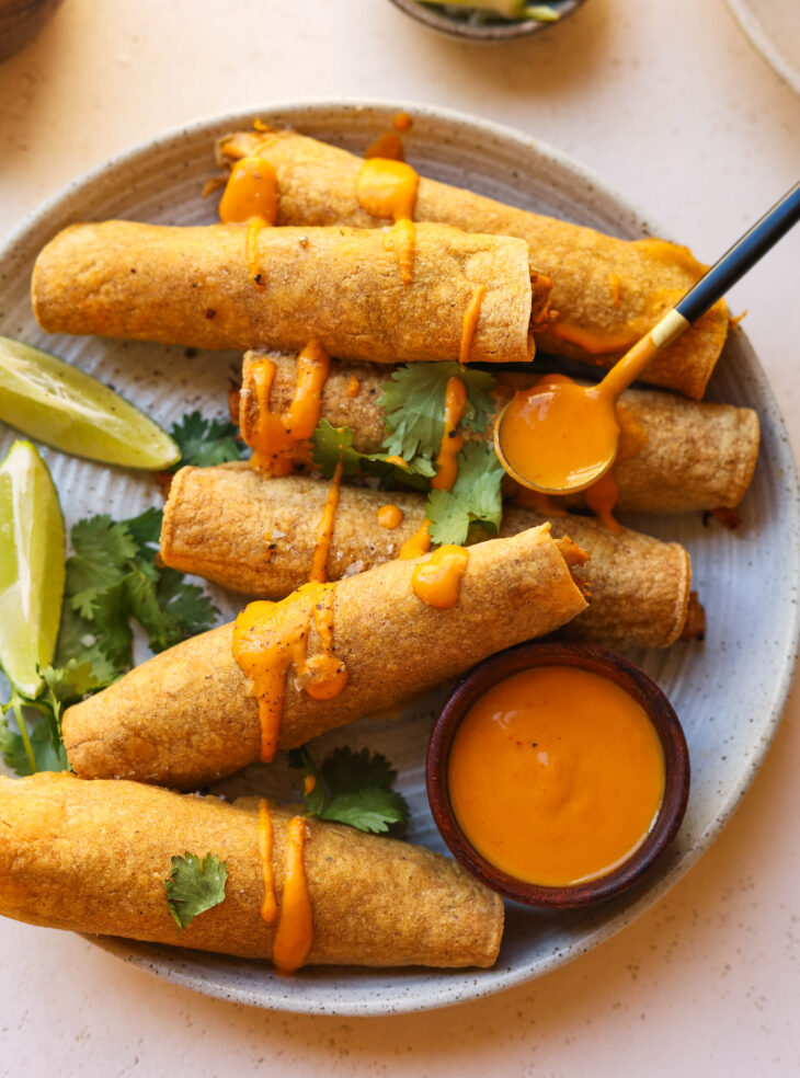 Crispy chicken taquitos will always take me back to my childhood. These are super easy to make – the filling is just a mix of shredded rotisserie chicken, salsa verde, shredded cheese, a touch of Greek yogurt for a creamy consistency, and a few smoky spices. Paired with a spicy homemade pumpkin chipotle sauce, and you have yourself the perfect meal to start diving into fall flavors!