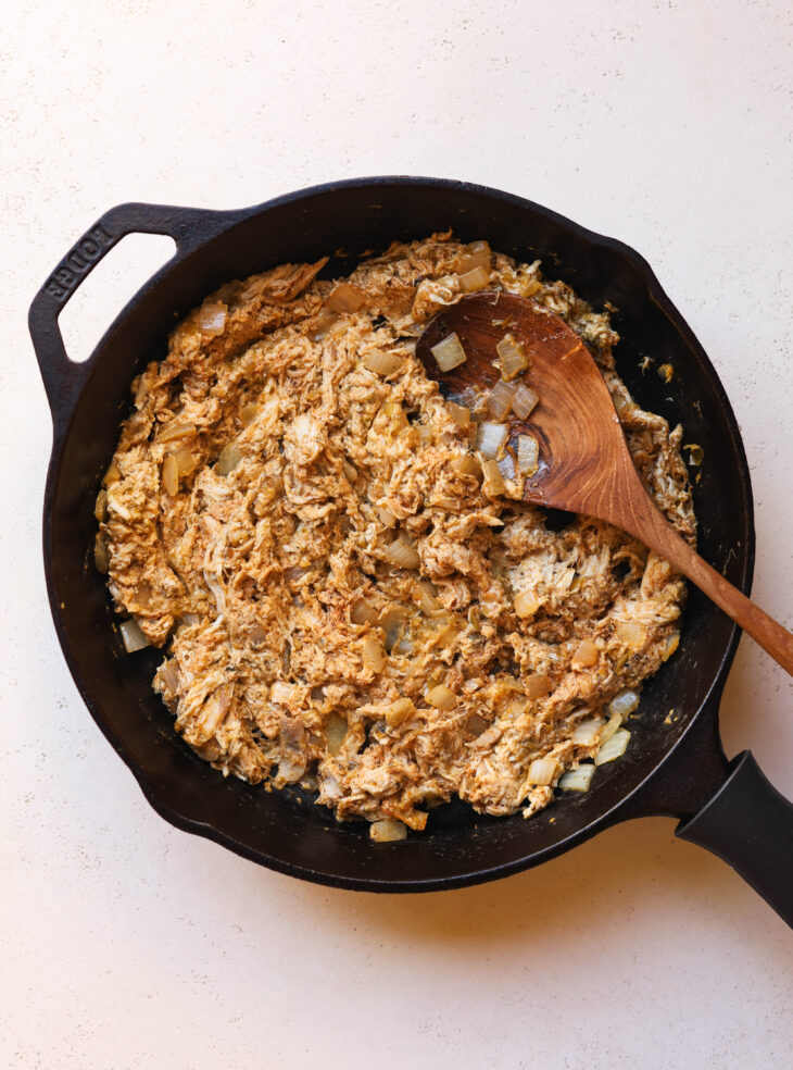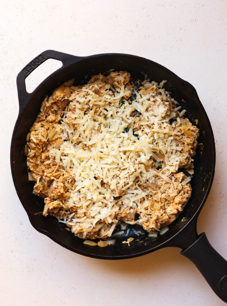 - Add the chicken, salsa, spices, yogurt and stir until well combined. Remove from heat, then stir in the cheese.