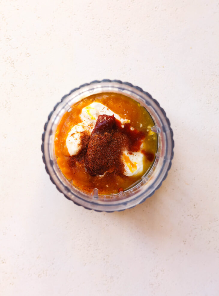 - Meanwhile, make the sauce by adding all of the ingredients to a high speed blender. Blend until smooth.
