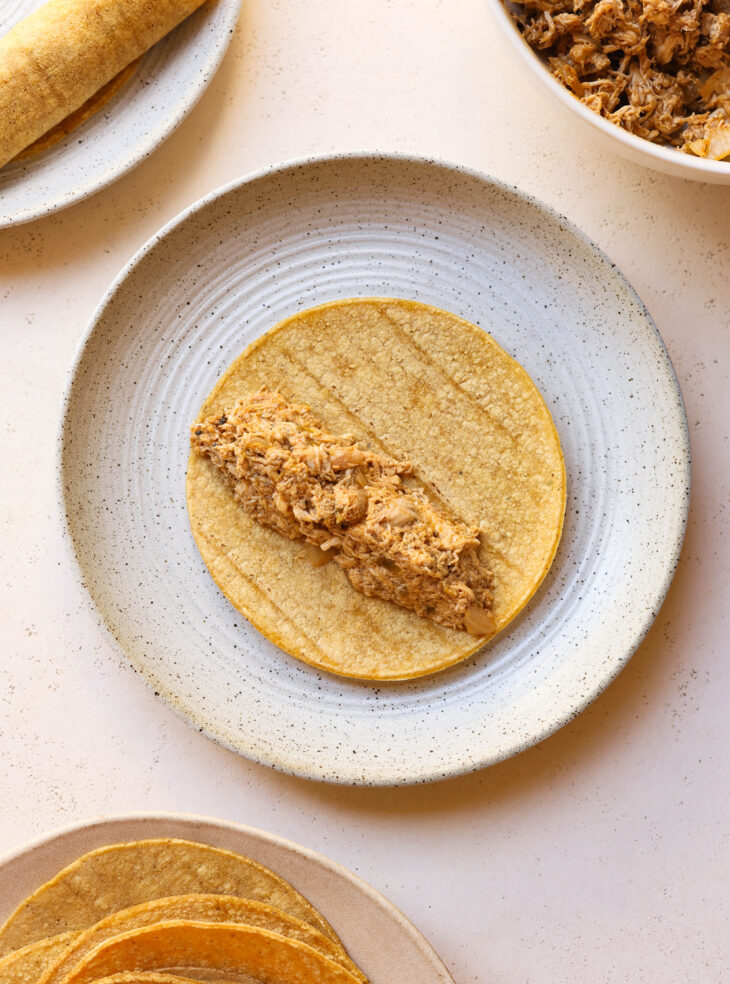 - Microwave the tortillas or heat them on a hot skillet so they’re pliable. Add about 2 tbsp of the filling to the end of the torilla and tightly roll into taquitos.