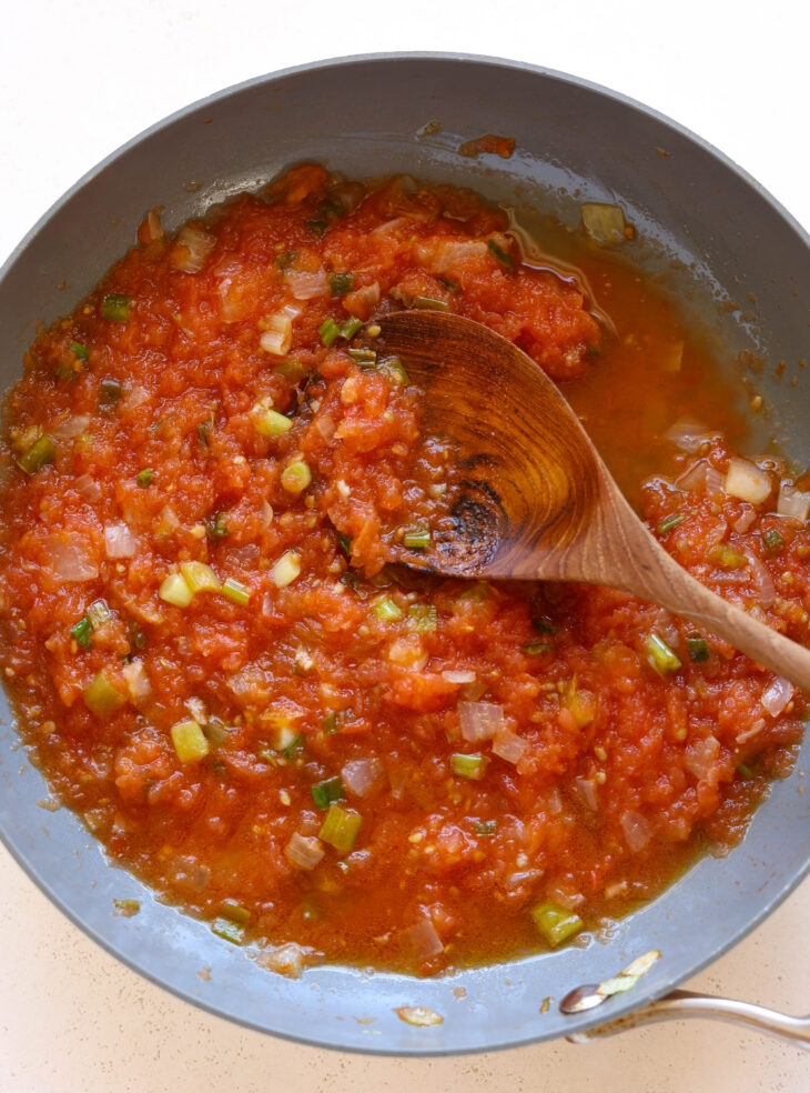 - Add the grated tomato and cook over medium heat for 5 minutes, mixing occasionally.